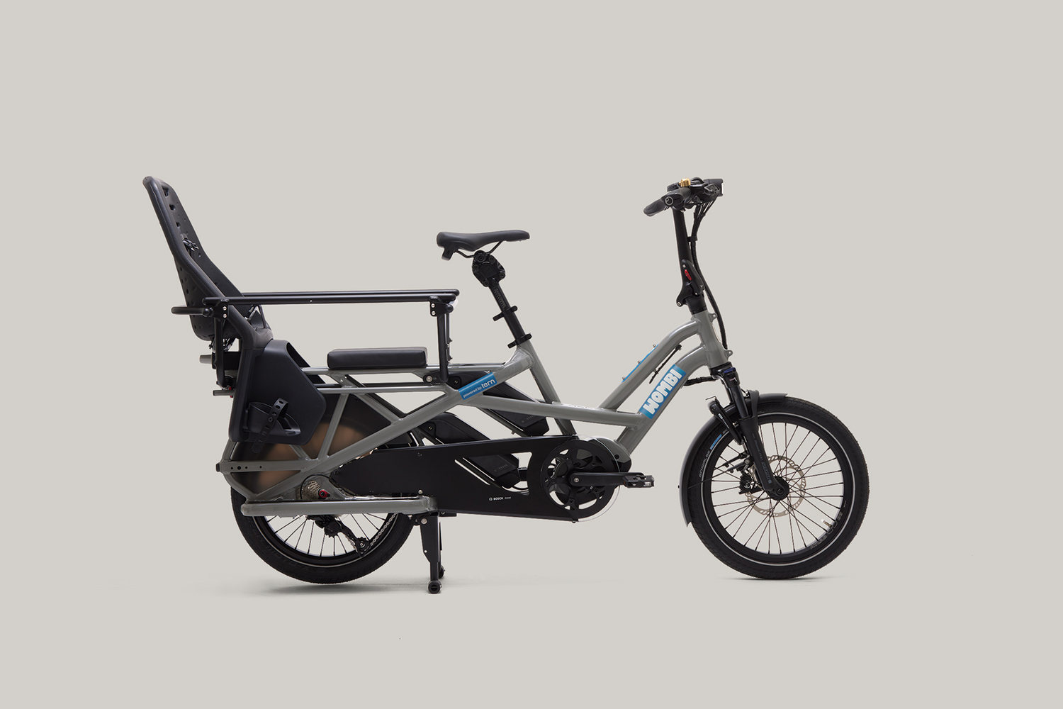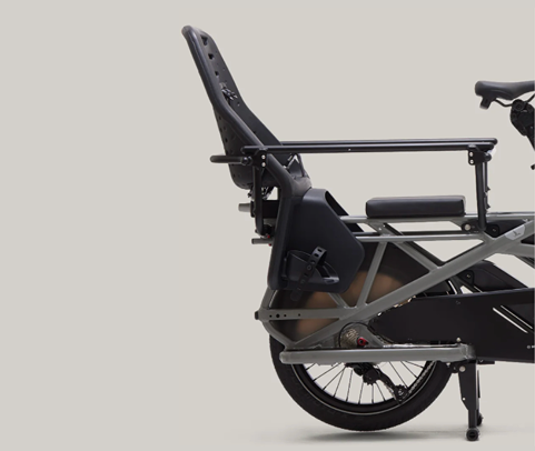 This is the Wombi e-bike leasing option to replace the family van. The GSD FamilyFlex makes it easy to carry two kids, all their sports gear and bags, while avoiding car tantrums. Our flexible e-bike subscription package allows you to swap any passenger seat accessories as your kiddos grow. This configuration is a “KidToT” - perfect for your 1-3 year old and your big kid (panniers not shown). Get VIP access to the top of the school drop-off and avoid parking anxiety at pick-up time. Customize your GSD e-bike subscription with a Transporteur Rack for super-parent carrying power.